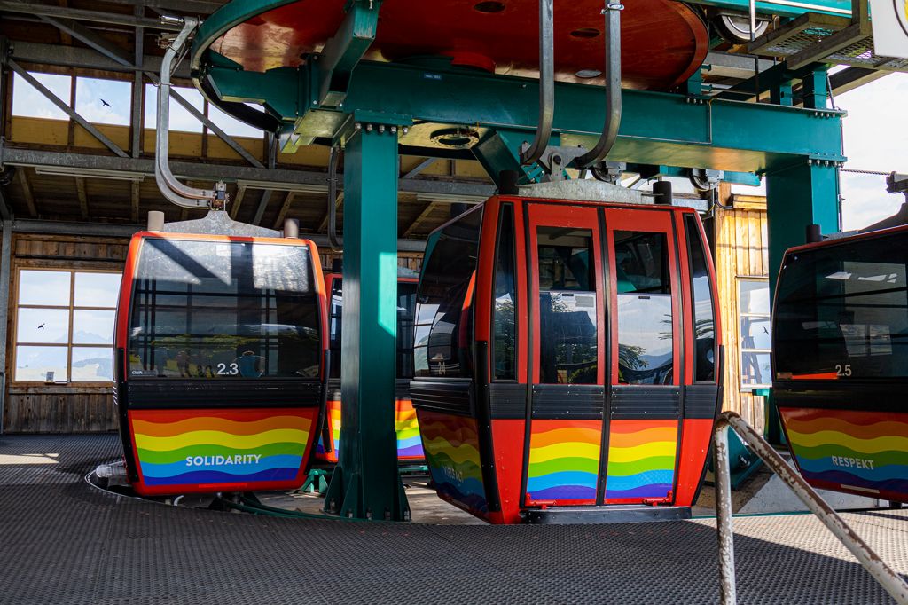 Regenbogen - Seit 2020 fahren die Gondeln in Regenbogenfarben. Zum Ein- und Aussteigen müssen stets alle fünf Gondeln einer Gruppe anhalten - was auch unterwegs zu einem Halt führt. • © alpintreff.de - Silke Schön