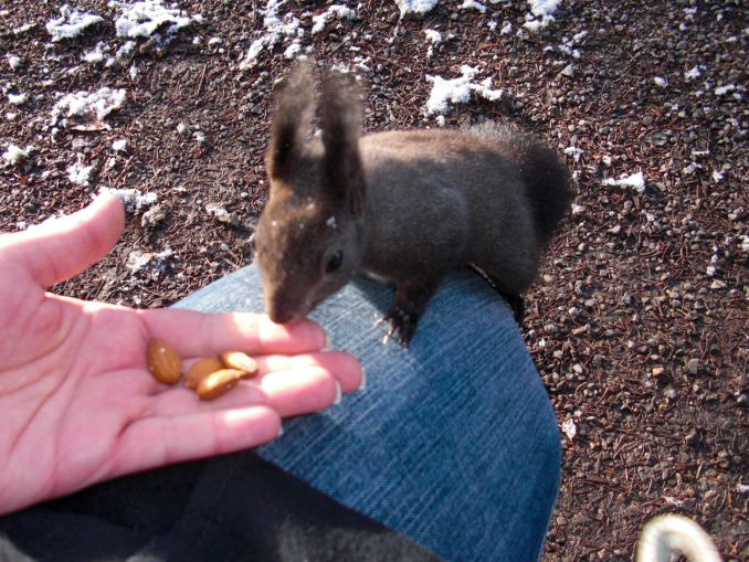 In einem bestimmen Wald in Fischen im Allgäu –im Weidachwald- leben sehr viele Eichhörnchen. Einige davon sind sehr zutraulich, sie wissen eben, dass die meisten Menschen nett zu ihnen sind und sie füttern. Das hat sich im Laufe der Jahre so ergeben und die Eichhörnchen sind nicht dumm. 🙂