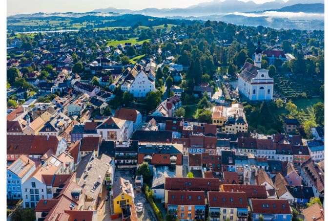 Murnau am Staffelsee von oben: der Untermarkt mit Schlossmuseum und Kirche. © Tourist Information Murnau am Staffelsee, Thomas Rychly