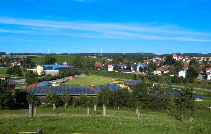 Ein Blick vom „Hungersberg“ auf Wildpoldsried. Pv-anlagen und Windräder gehören zum Ortsbild. © Gemeinde Wildpoldsried