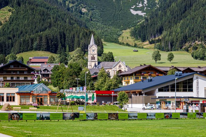 Der Ort Ramsau liegt nahezu direkt am Dachsteinmassiv. Die imposante Kulisse ist dementsprechend aus dem ganzen Ort heraus sichtbar.